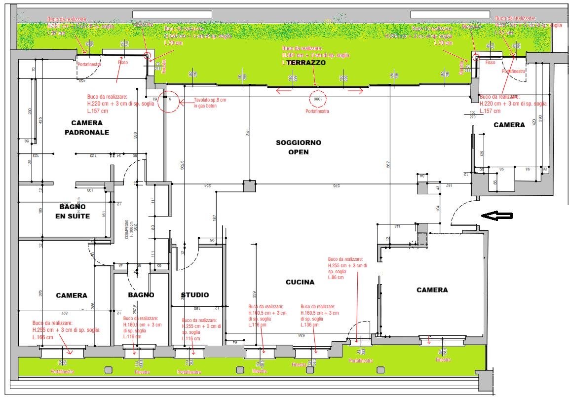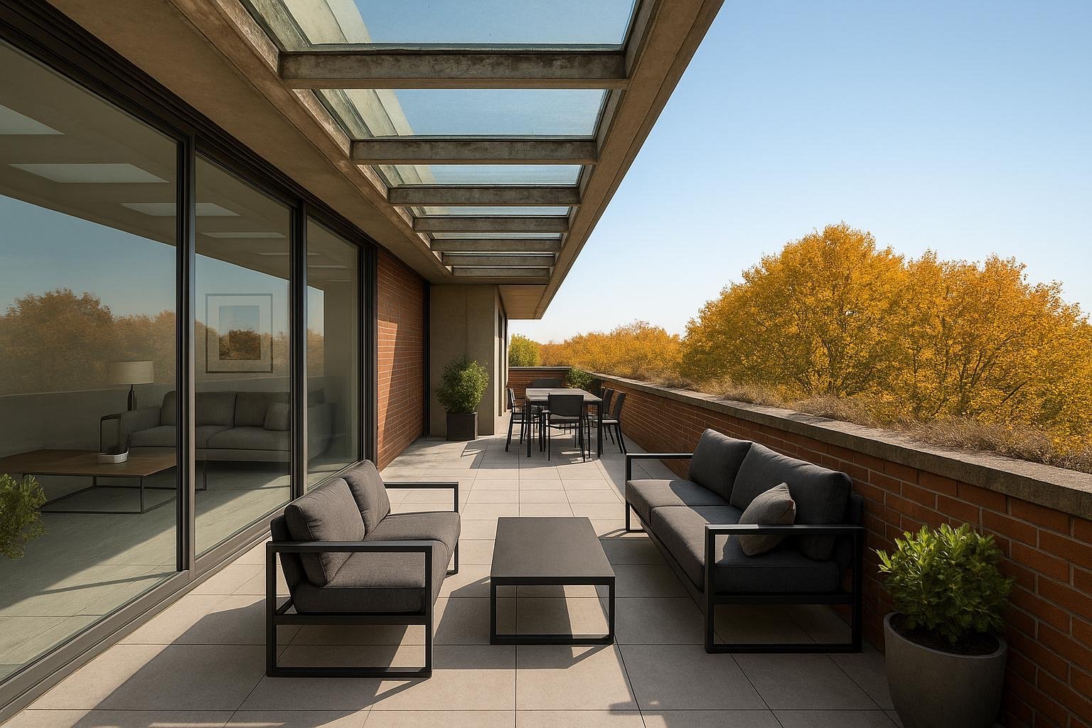 L’ingresso conduce a un’ampia zona giorno open space, illuminata da una spettacolare vetrata cielo-terra che si apre direttamente sul terrazzo, trasformandolo – soprattutto d’estate – in una vera e propria estensione della casa, ideale per living, dining e momenti di relax.La proprietà offre inoltre: